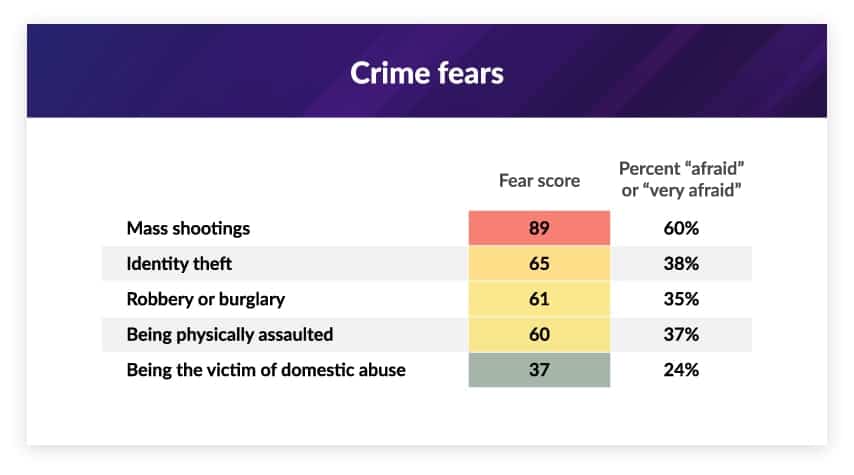 Urban crime rates are higher today than before the pandemic. In 2022, high-profile active shooter incidents surged, and school shootings increased in 2023. Our findings reflect these realities: gun violence was the 5th scariest situation in our ranking, with 54 percent of Americans expressing fear about this threat. Identity theft and robbery were other crimes with fear scores in the 60s.